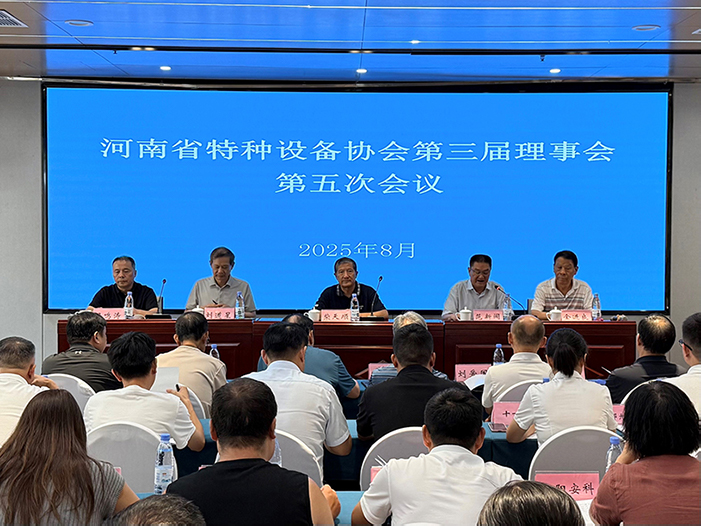 2025年86日,河南省特种设备协会第三届理事会第五次会议在郑州羚锐酒店隆重召开。协会会长柴天顺、副会长范新闻、秘书长金进良、原省市场监管局二级巡视员刘道星、原省市场监管局二级调研员吕鸣涛、省锅检院院长马江东、省特检院院长张华军及各特种设备企业理事单位代表等50余人参会。会议由协会副会长范新闻主持。