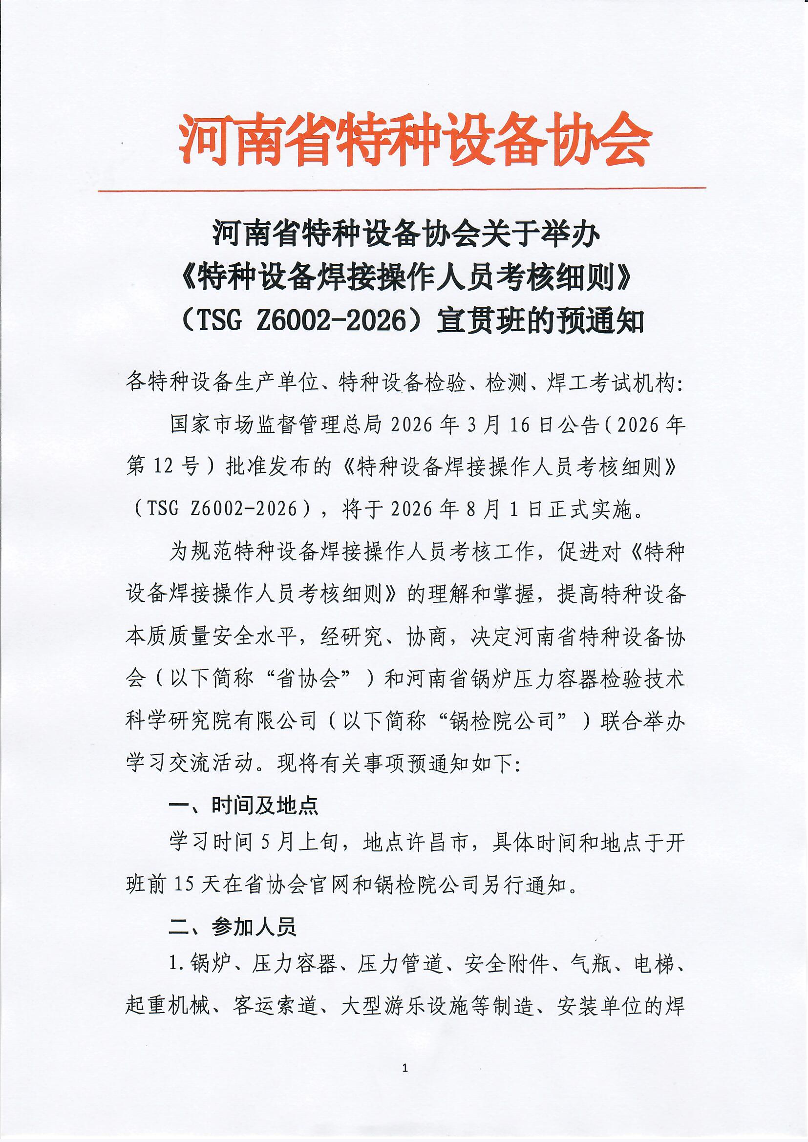 网站首页 - 通知公告-河南省特种设备协会关于举办 《特种设备焊接操作人员考核细则》 (TSG Z6002-2026)宣贯班的预通知
