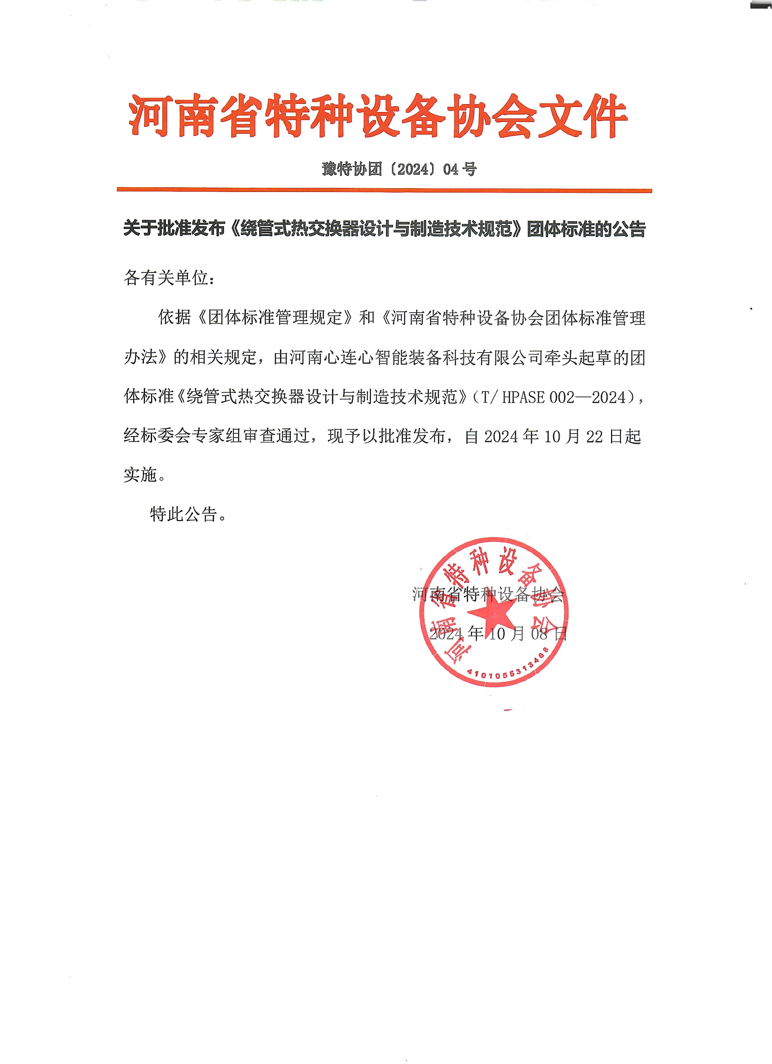关于批准发布《绕管式热交换器设计与制造技术规范》团体标准的公告
